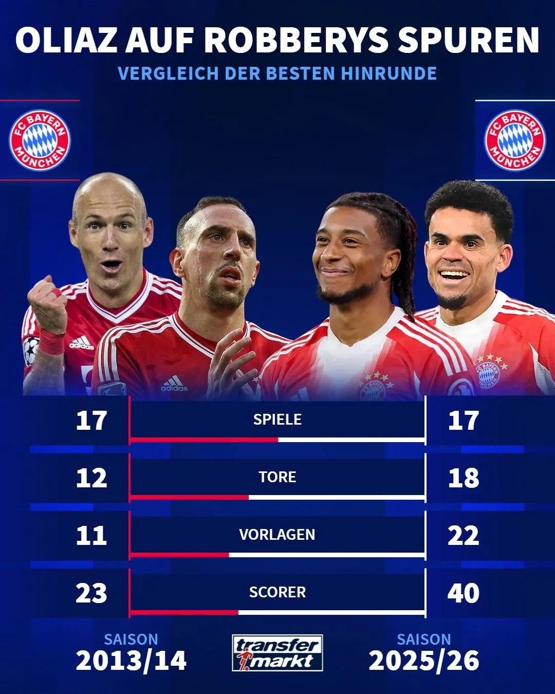 而13/14赛季的罗本、里贝里在德甲上半程合计参与了23球,具体为12个进球、11次助攻。